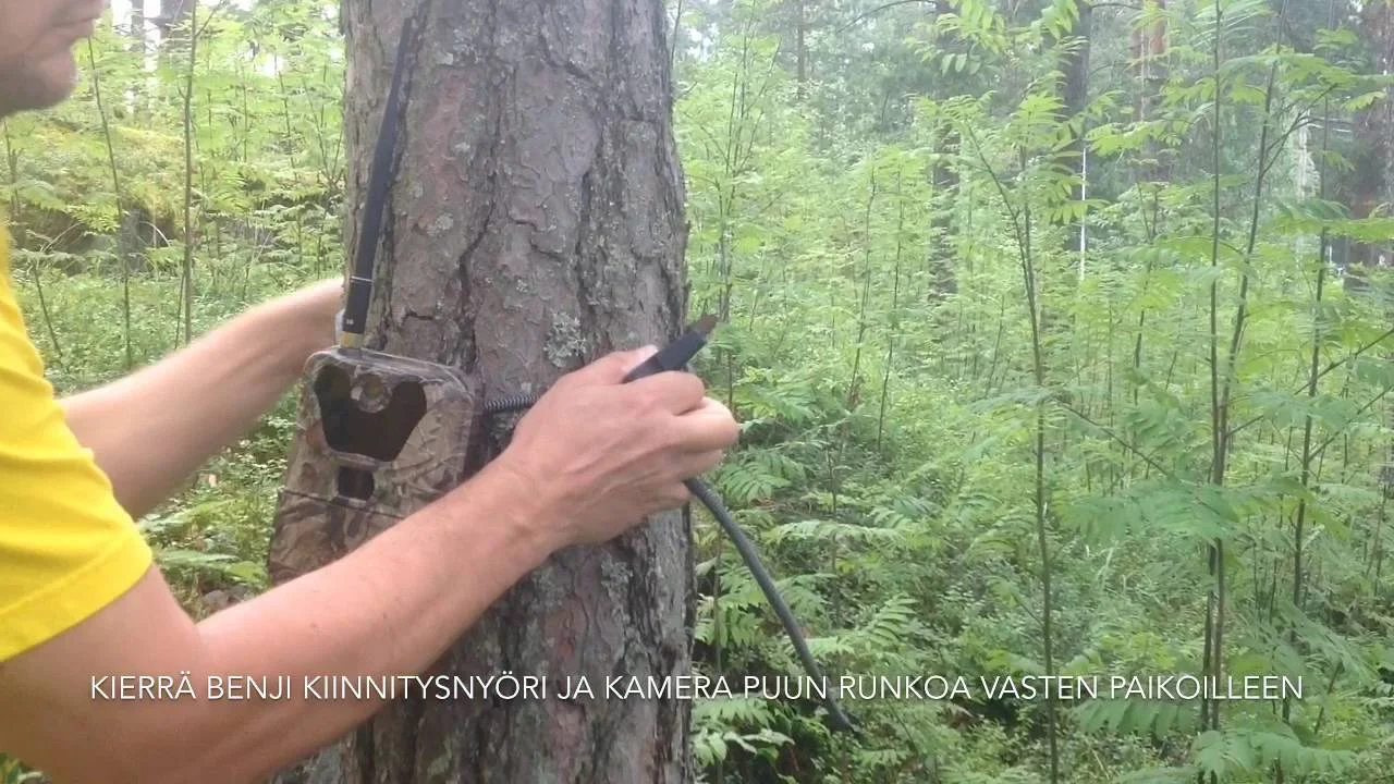 * Tiukkaa riistakameran nopeasti puunrunkoa vasten aina sopivalla tiukkuudella
